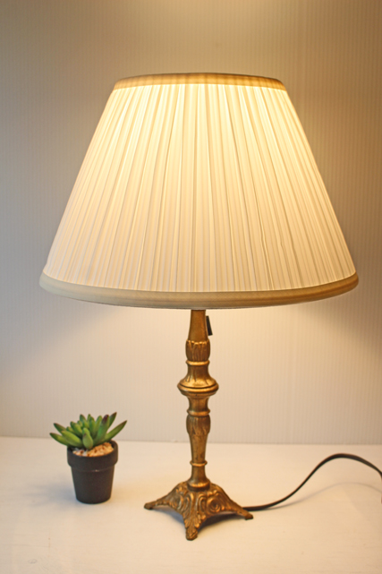 デンマークで見つけた真鍮のテーブルランプです。こちらはシンプルなフォルムの真鍮ランプで、クラシカルな印象です。電気器具は、日本仕様に国内メーカーに依頼して取り付けていただいておりますのですぐにお使いいただけます。シェードはオリジナルではありませんが、シェード専門店にてプリーツ素材のシンプルなものを購入しました。ランプのサイズに合わせてお付けしていますが、シェードが不要の場合は、定価より2500円引きとさせていただきます。