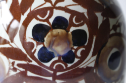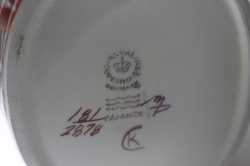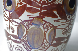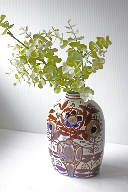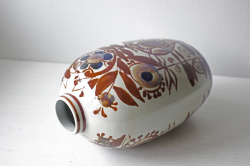 デンマーク、Alminia/Royal Copenhagen(ロイヤルコペンハーゲン)のテネラシリーズの花瓶です。こちらは、Kari Christensen ( カリ・クリステンセン )デザインで丸みを帯びた女性らしいフォルムにお花が抽象的にデザインされており、パープルやブラウンの配色で落ち着いた雰囲気です。花弁に濃いネイビーを使うことによって全体を引き締めています。