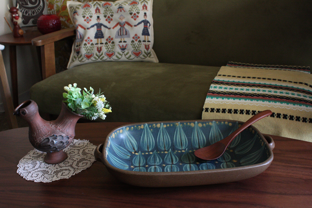 デンマーク、DYBDAHLの長皿です。ブラウン上にブルーグリーンやイエローが彩色された落ち着いた色合いです。34cmある大きめで深さのあるお皿ですので、たっぷりのおもてなしに最適です。DYBDAHLの陶器はどこか素朴で温かな雰囲気があり、ホッと和みます。