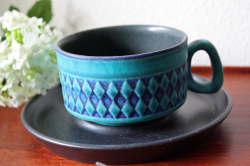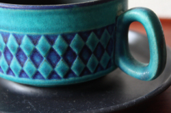 旧西ドイツ、ceramanoのカップ&ソーサーです。土の温かさを感じる厚みのあるフォルムにマットな釉薬がかけられています。エキゾチックなターコイズブルーと内側とソーサーの黒がレトロで渋さを感じさせます。男性がお使いいただいてもしっくりと馴染むでしょう。