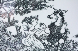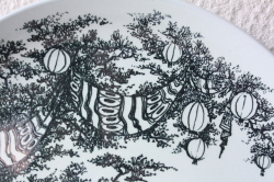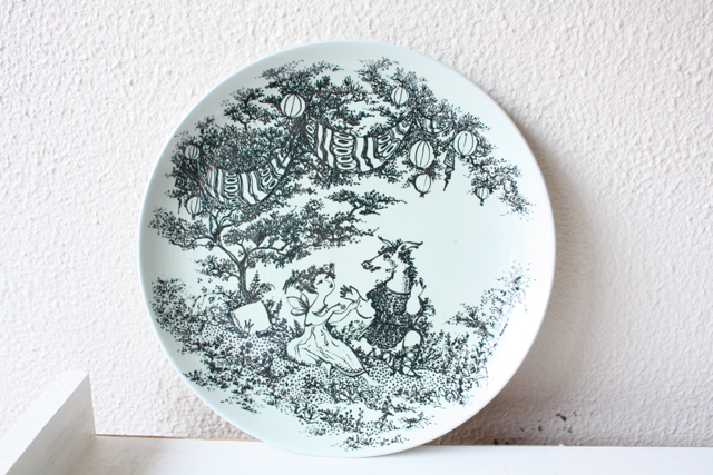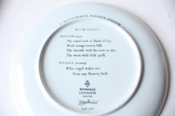 デンマークで人気の国民的アーティスト/Bjorn Wiinblad(ヴョルン・ウィンブラッド)の壁掛けプレートです。こちらはシェイクスピアの喜劇「真夏の夜の夢」の1場面を描いたデザインとなっています。シーン3は、妖精パックが職人ボトムの頭をロバに変え、媚薬をまぶたに塗られた妖精の女王タイターニアが目を覚まし、この奇妙なものに心を奪われる場面が描かれています。裏面には、その場面の解説が載っています。
