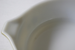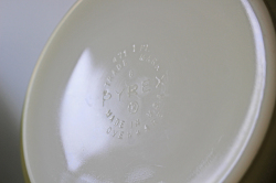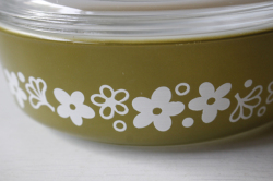 アメリカ製の耐熱ガラスのキャセロールです。デイジーシリーズという可愛らしい小花モチーフが当時もとても人気があったシリーズで、優しいお色のミルクガラス×オリーブグリーンがレトロ感満載です。使いやすいサイズ感で野菜やお肉料理などをオーブン料理する際には蓋も付いていますので、とても機能的です。強い素材でもありますので、デイリー使いにもピッタリです。