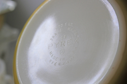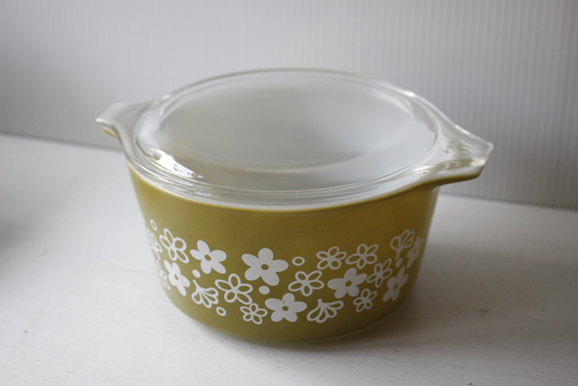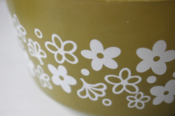 アメリカ製の耐熱ガラスのキャセロールです。デイジーシリーズという可愛らしい小花モチーフが当時もとても人気があったシリーズで、優しいお色のミルクガラス×オリーブグリーンがレトロ感満載です。使いやすいサイズ感で野菜やお肉料理などをオーブン料理する際には蓋も付いていますので、とても機能的です。強い素材でもありますので、デイリー使いにもピッタリです。