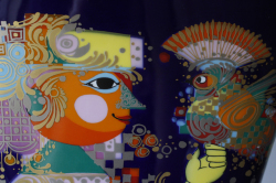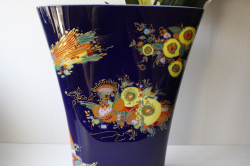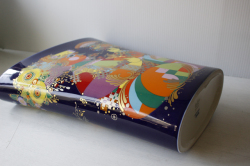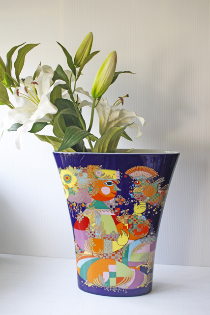 ドイツの一流ブランド、ローゼンタールのスタジオラインにて製造されたデンマークの人気デザイナーBjorn Wiinblad(ヴョルン・ウィンブラッド)の美しい花瓶です。こちらは、カラフルな多彩色を使用したヴィヨルンらしい作品でエキゾチックな衣装に両手に鳥をのせたデザインになっています。背景がネイビーでカラフルな色合いが映えますね。大きなサイズなので、枝ものやカサブランカなどにも対応可能です。